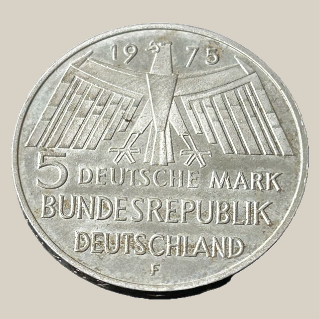 Esta moeda de 5 Deutsche Mark, cunhada em 1975, celebra o Ano Europeu do Património Arquitetónico, uma iniciativa importante para a conservação dos edifícios históricos na Europa. A emissão pela República Federal da Alemanha sublinha o papel do país na cooperação cultural europeia e na valorização de seu próprio património.
