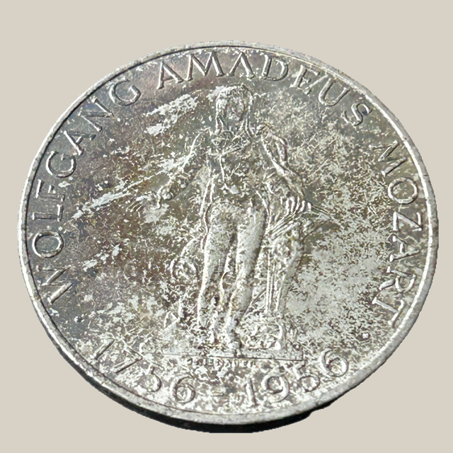 Esta moeda de 25 Schilling, cunhada em 1956, comemora o 200º aniversário do nascimento de Wolfgang Amadeus Mozart. A emissão é particularmente significativa porque ocorreu logo após a Áustria recuperar sua soberania total com o Tratado do Estado Austríaco de 1955. Celebrar Mozart foi uma forma de reafirmar a identidade cultural austríaca no cenário internacional.