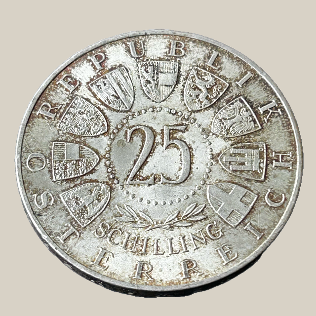 • O alto teor de prata de 800‰ era o padrão para as moedas comemorativas de 25 Schilling da Áustria.