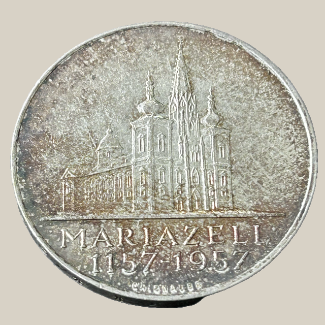 Esta moeda de 25 Schilling, cunhada em 1957, comemora o 700º aniversário do Santuário de Mariazell na Estíria. A basílica é o centro de peregrinação mais importante da Áustria e tem uma profunda importância religiosa e cultural para o país e para a região.