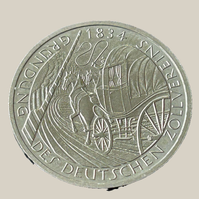 Esta moeda de 5 Deutsche Mark, cunhada em 1984, celebra o 150º aniversário da fundação do Deutscher Zollverein (União Aduaneira Alemã) em 1834. O Zollverein foi um marco crucial na história alemã, estabelecendo uma área de livre comércio e representando um passo fundamental para a unificação política posterior.