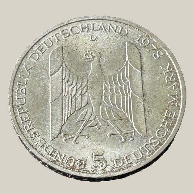 Esta moeda de 5 Deutsche Mark, cunhada em 1978, celebra o 100º aniversário do nascimento de Gustav Stresemann. Stresemann foi Chanceler e Ministro das Relações Exteriores da República de Weimar e uma figura essencial na política europeia da década de 1920. Ele recebeu o Prêmio Nobel da Paz em 1926 por seu trabalho na reconciliação franco-alemã.