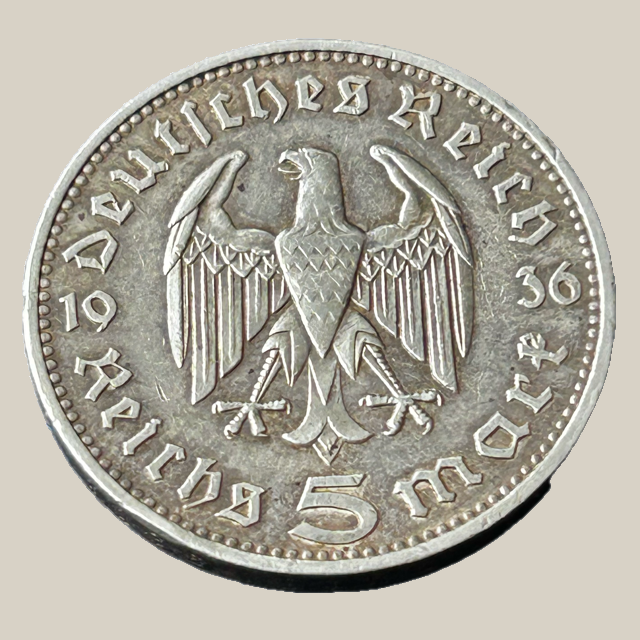 Esta moeda de 5 Reichsmark, cunhada em 1936, é uma peça de transição e a última da série comemorativa da morte de Paul von Hindenburg. Hindenburg, o último Presidente do Reich, morreu em 1934, e esta série foi emitida para marcar o luto oficial. No entanto, o seu desenho no anverso foi rapidamente descontinuado pelo regime de Hitler, que não queria a imagem de Hindenburg nas moedas. A partir de 1937, o anverso das moedas de 5 Reichsmark seria ocupado exclusivamente pela águia Nazista e a suástica.