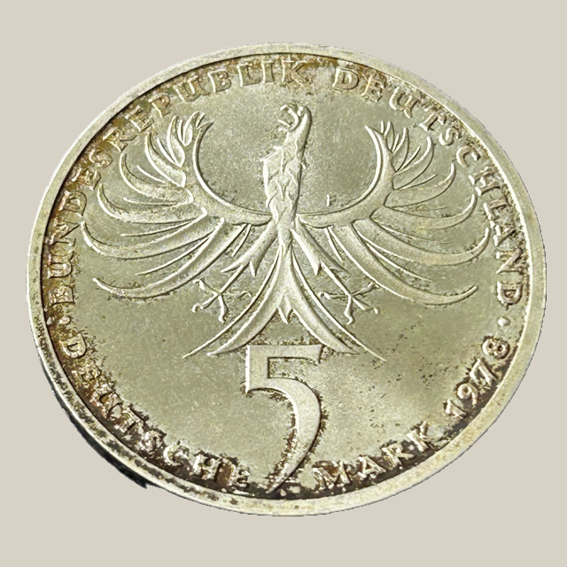 A letra F identifica a Casa da Moeda de Stuttgart. Esta foi uma das últimas emissões em prata da série comemorativa de 5 DM, antes da transição para metais não preciosos em 1979.
