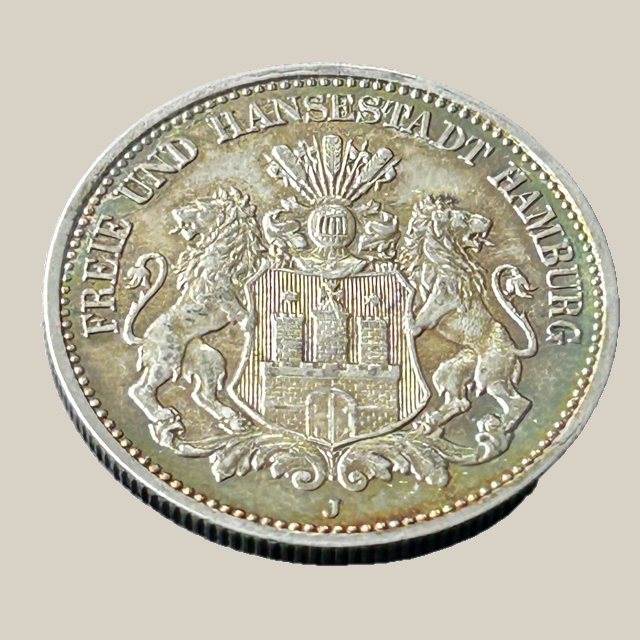 Esta moeda de 2 Mark, cunhada em 1911, é uma emissão da Cidade Livre Hanseática de Hamburgo no contexto do Império Alemão (1871-1918). Diferentemente da maioria dos estados que exibiam o busto de um monarca (Rei ou Duque), as Cidades Livres (Hamburgo, Bremen e Lübeck) mantiveram seus brasões de armas, simbolizando sua autonomia e tradição republicana e hanseática.