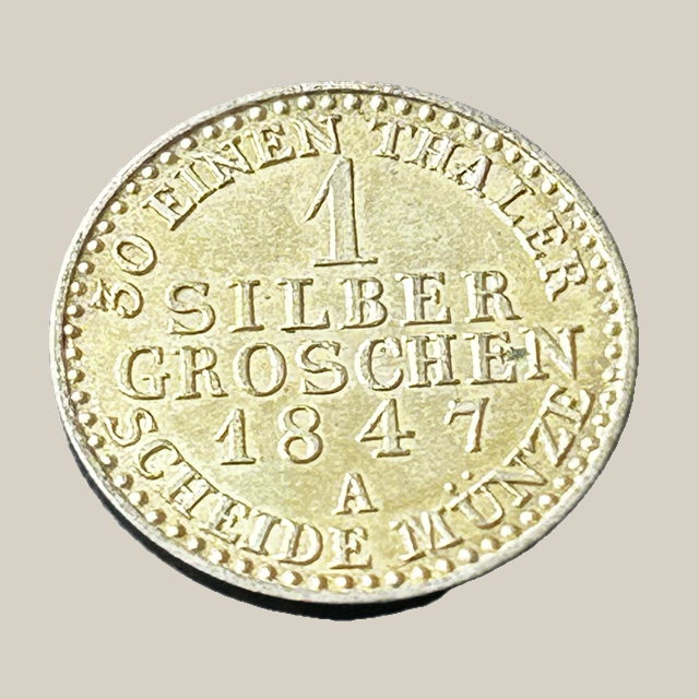 O 1 Silbergroschen de 1847 foi cunhado durante o reinado de Friedrich Wilhelm IV (1840–1861), um período marcado por agitações políticas e pela Revolução de 1848 na Europa. A moeda fazia parte do sistema monetário prussiano, no qual 30 Silbergroschen correspondiam a 1 Thaler.