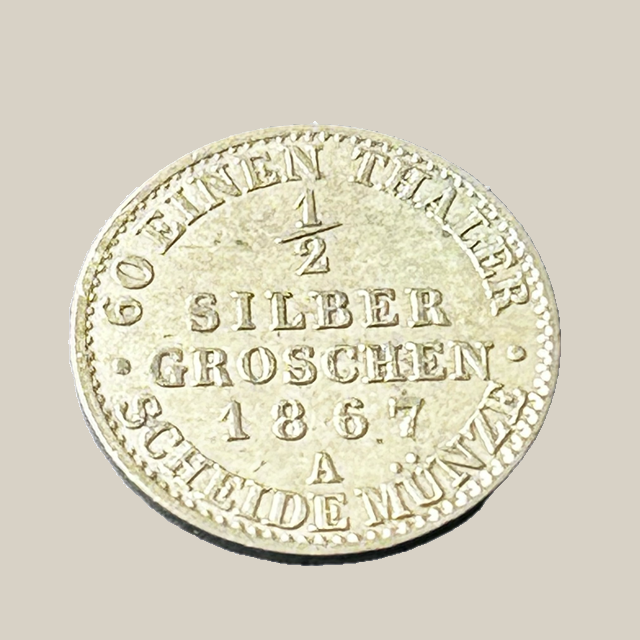 O 1/2 Silbergroschen de 1867 foi emitido sob o governo do Reino da Prússia, ainda no período que antecedeu a formação do Império Alemão (1871). Essa moeda integra a série de frações de Silbergroschen, que seguiam a lógica do sistema prussiano, em que 60 Silbergroschen formavam 1 Thaler.