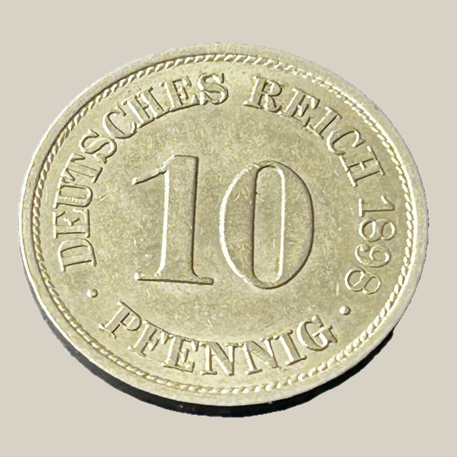 O 10 Pfennigs de cuproníquel circulava amplamente no comércio diário, representando 1/10 de Marco dentro do sistema monetário decimal unificado desde 1873.
