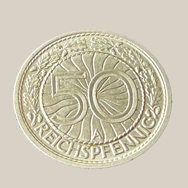 Este 50 Reichspfennigs de 1929 pertence ao período da República de Weimar, um dos mais conturbados da história alemã. Cunhado em Berlim, circulou em meio à instabilidade política e econômica que marcou os anos finais da década de 1920, pouco antes da ascensão do nazismo em 1933.
