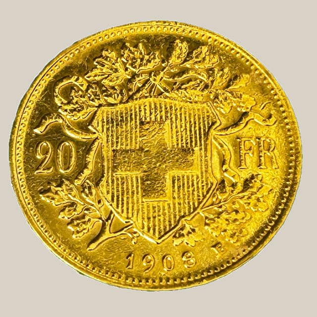 O 20 Francs “Vreneli” é a moeda de ouro mais emblemática da Suíça, cunhada entre o final do século XIX e meados do século XX. O exemplar de 1908, Casa da Moeda de Berna, pertence às primeiras emissões do tipo, período em que a Suíça consolidava sua estabilidade econômica e monetária, e foram feitas 355.000 exemplares.