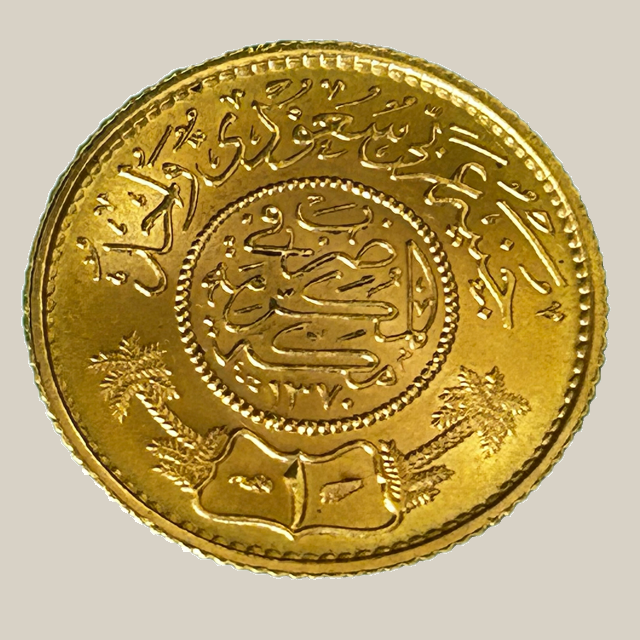 O Gunayh de ouro da Arábia Saudita foi introduzido como parte da consolidação monetária do reino sob o governo do Rei Abdulaziz ibn Saud, fundador do Estado saudita moderno. Cunhado em 1370 AH (1951), este exemplar reflete o fortalecimento institucional e econômico do país no pós-guerra.