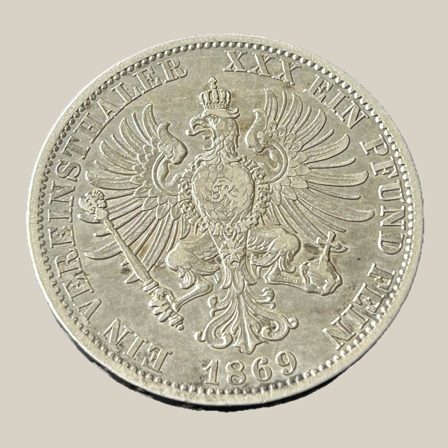 Este 1 Vereinsthaler de 1869 é uma peça de grande significado histórico. O Vereinsthaler (padrão de prata anterior ao Mark).