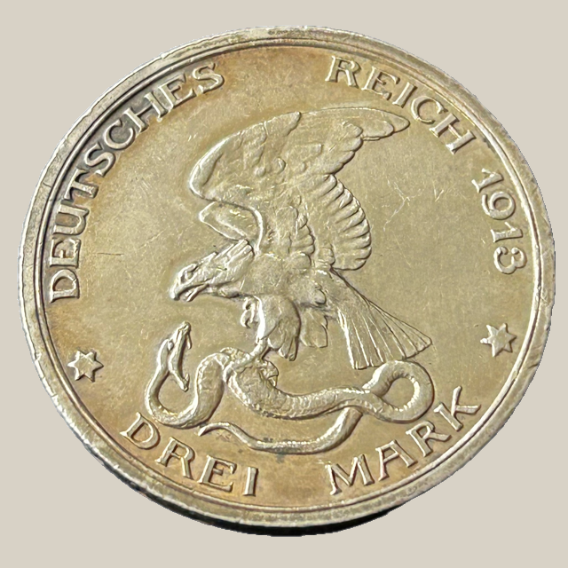 Esta moeda de 3 Mark, cunhada em 1913, é a versão de maior valor da celebração do centenário da Guerra de Libertação (Befreiungskriege). Em 1813, a Prússia se uniu à coalizão contra as forças napoleônicas. Este evento foi fundamental para a formação da identidade nacional alemã e para o poder prussiano que culminaria na unificação de 1871.
